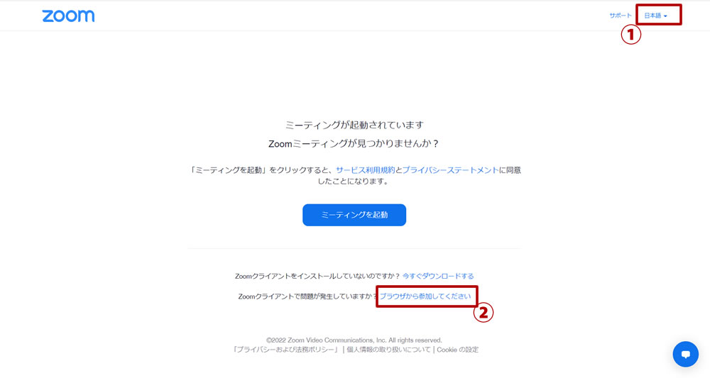 表示されたページがすべて英語でしたら上記画像①箇所を日本語に変更し、赤枠②「ブラウザーから参加してください」をクリックします。